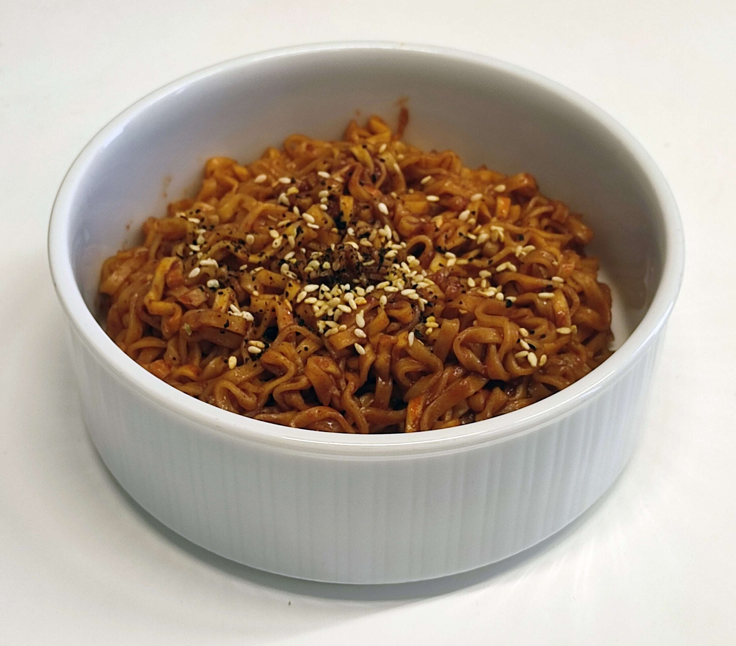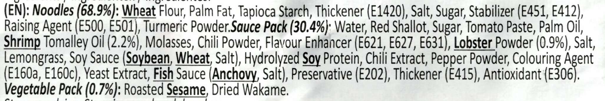 Die Tüte enthält das bereits bekannte Rondell fritierter, vorgewürzter Nudeln – auch gut als Trockensnack essbar. Dazu eine große Tüte mit scharfer Lobstersauce und ein kleineres Tütchen mit Sesam und Algenschnipseln (Disclaimer: da ich das Foto verschusselt habe, kommt hier ein Inhaltsfoto der optisch praktisch identischen #2976).