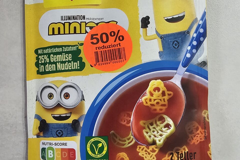 Passend zu Film 3645 der animierten Reihe gab es, offensichtlich, eine Sonderedition der Tomatensuppe von Maggi. Auch wenn ich wahrlich alles andere als ein Fan von den nervigen, gelben Schergen bin, konnte es mich dann doch nicht davon abhalten diese Suppe zu kaufen. 50% drauf. Da kann man über die Namensgeber wohl hinwegsehen. Dazu noch Gemüsenudeln!? Wollen wa mal schauen was die kann.