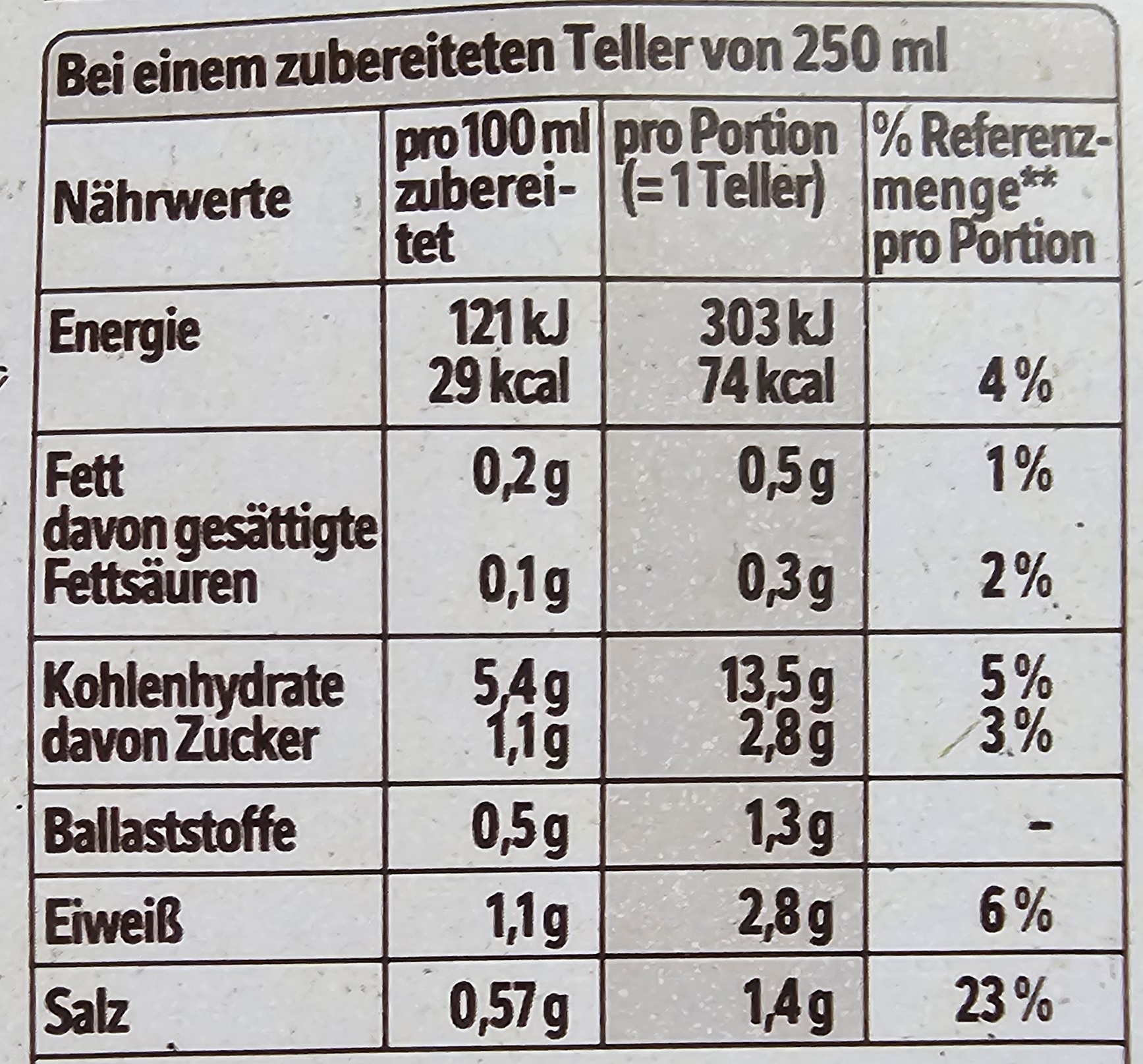 | kcal 100 ml/g (Gesamt): | 29 kcal |
