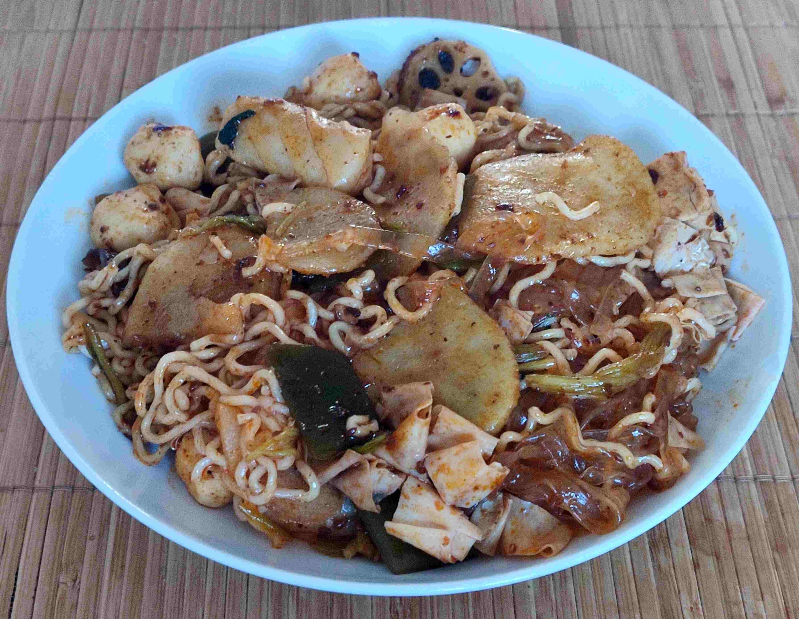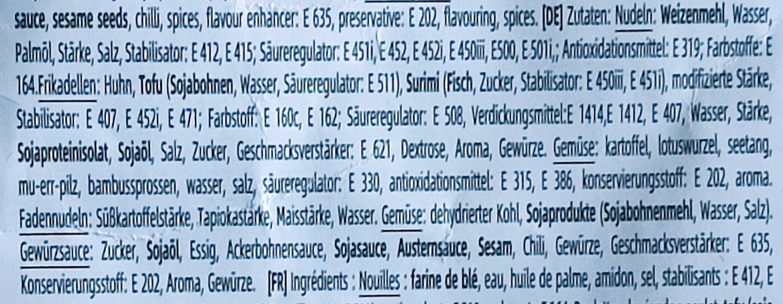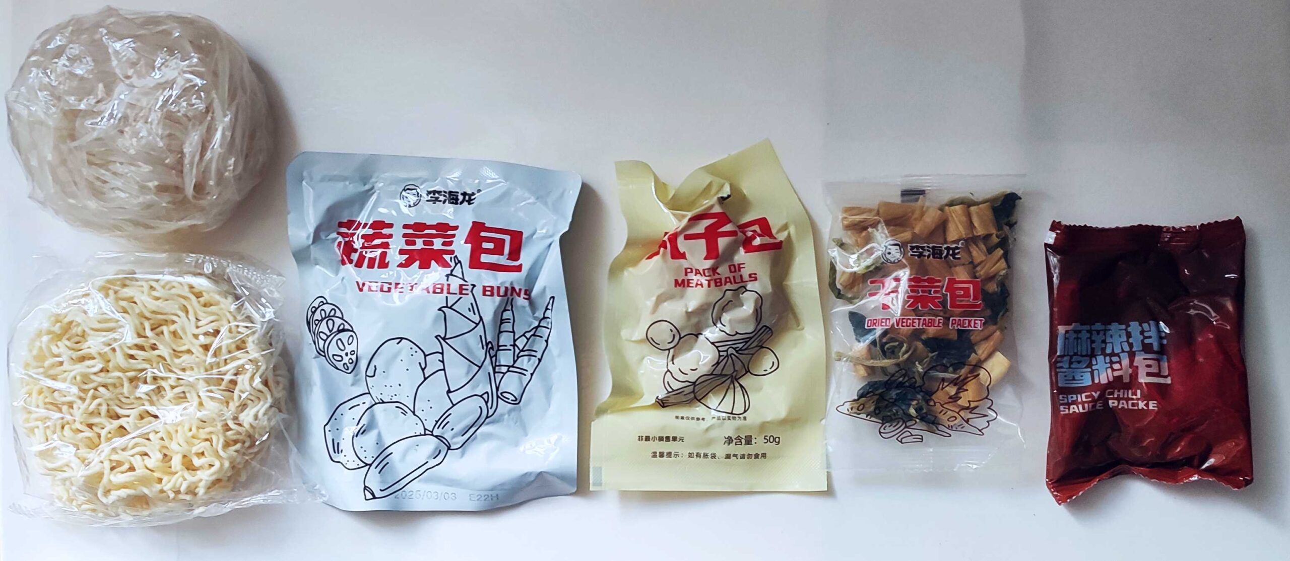 Die Tüte enthält je ein Nest Weizennudeln und Süßkartoffel-Bandnudeln, außerdem gemischte gekochte Gemüse (u.a. Kartoffel, Lotuswurzel, Seetang, Holzohr), Sojahaut und Trockengemüse, eine Tüte mit Fleischbällchen, Surimi und Tofu, außerdem die Würzsauce – reichlich bestückt ist diese Tüte auf jeden Fall!