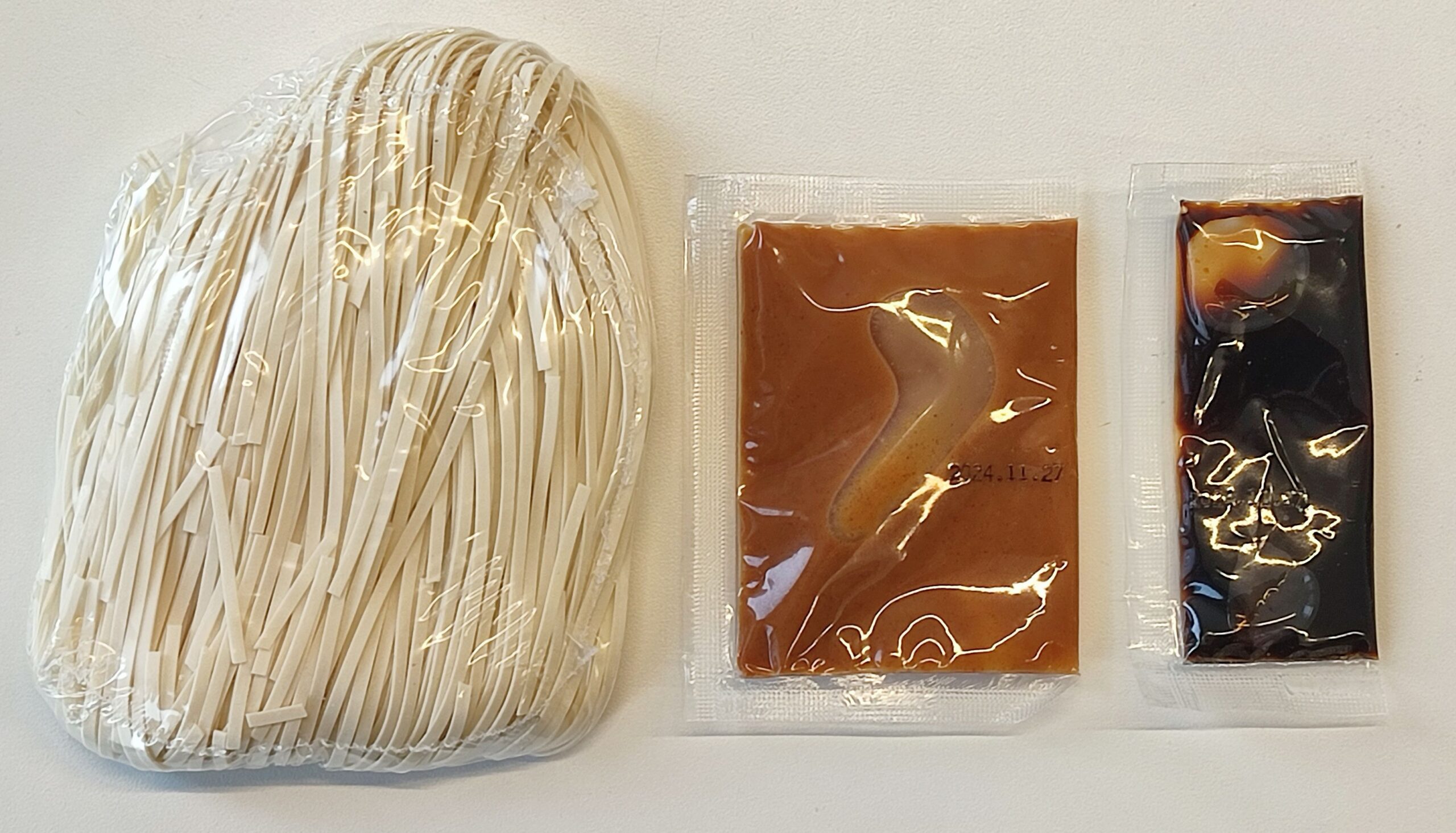 Die Tüte enthält einen Zopf dünner Weizennudeln sowie Tütchen mit Erdnuss- und mit Sojasauce, also alles überschaubar.
