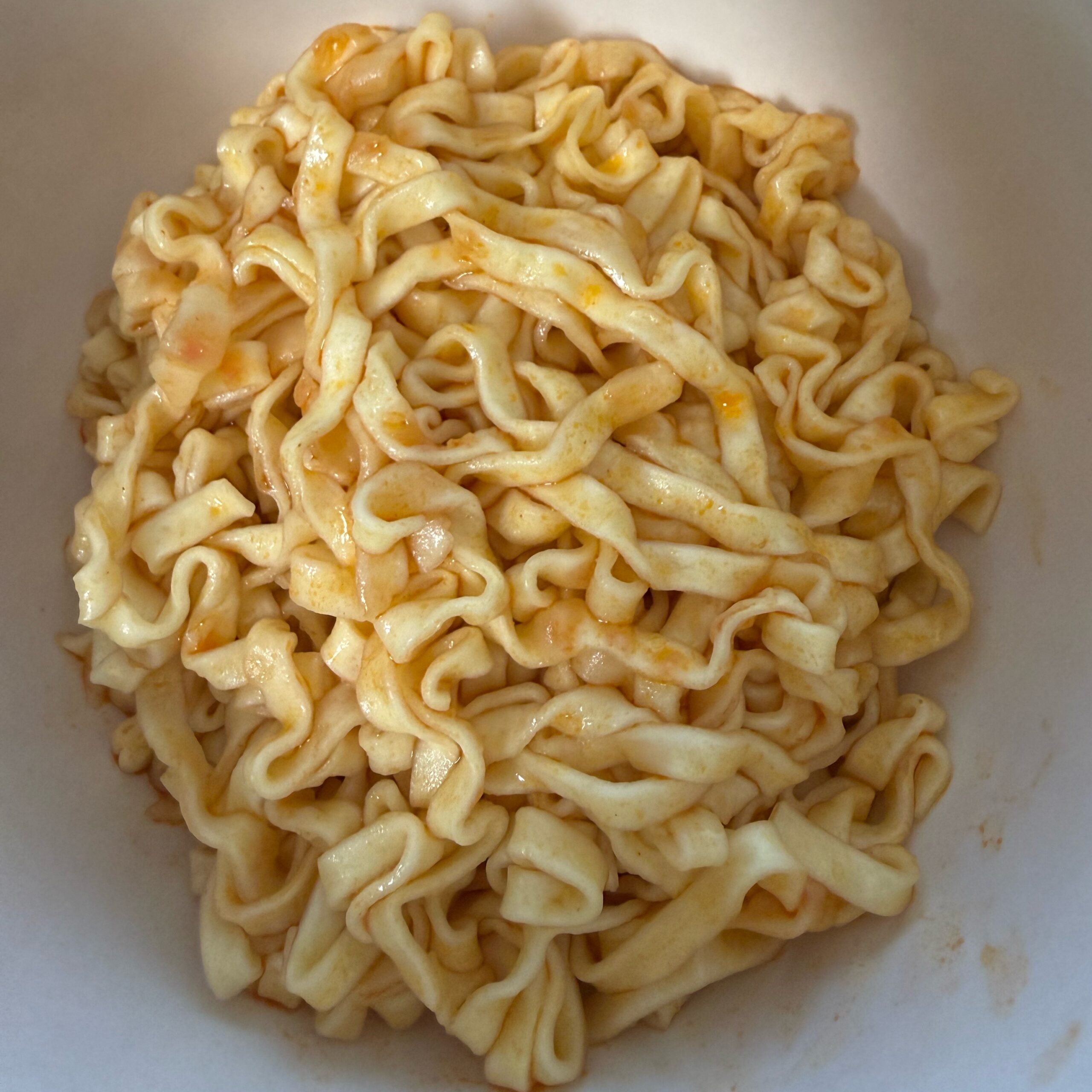 Fazit: Die Nudeln sind Klasse: breit, wellig, gleichmäßig gegart – sehr schön! Vom Suppenpulver ist ein kleines bisschen Salz in den Nudeln hängengeblieben. Und sonst? Vor allem Chiliaromen und Koriander, von Huhn habe ich nicht ausmachen können und sauer war bei „meiner“ Zubereitung auch nix. Die Schärfe ist ordentlich, aber dennoch sind die Nudeln etwas fade. So wie aufgedruckt zubereitet ist das nicht so toll – ich bin gespannt auf Marcus‘ Eindrücke!