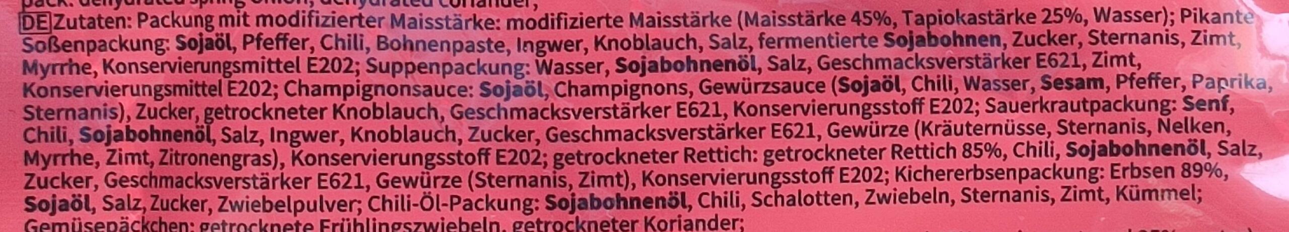In der Tüte bekommen wir außer dem Nudelpaket stolze 8 weitere Päckchen: Würzpaste (auf der Basis von Bohnenpaste), ein milchig-weißes Suppenkonzentrat, Pilzwürzpaste, eingelegten Senfkohl, eingelegten Rettich, geröstete Zuckererbsen („Kichererbse“ ist falsch übersetzt), knackig scharfes Chiliöl/-paste sowie Trockengemüse (Frühlingszwiebel und Koriander).