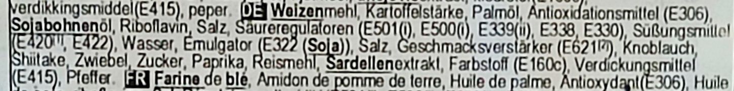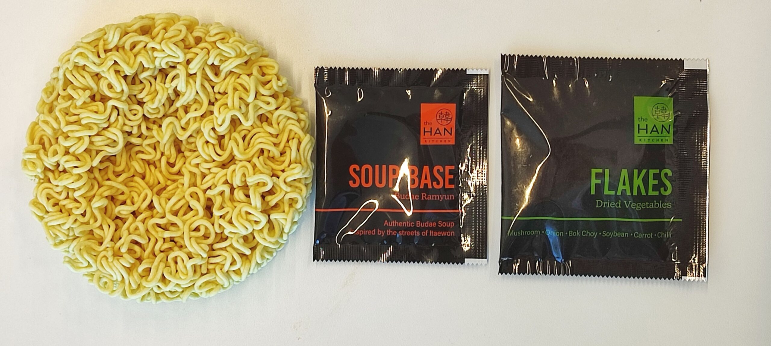 Ich hatte von der Firma mal was beim Ramen Rater gesehen, hab aber jetzt erst genauer hingeschaut: dahinter steckt ByAsia Food, eine australische Firma, die Produkte der Han Kitchen werden in Südkorea hergestellt, angeblich von Cubix Ltd. Wie auch immer, die Tüte enthält ein großes Nest dicker, fritierter Nudeln, außerdem zwei Tütchen: mit Suppenpulver und mit Trockenzutaten.
