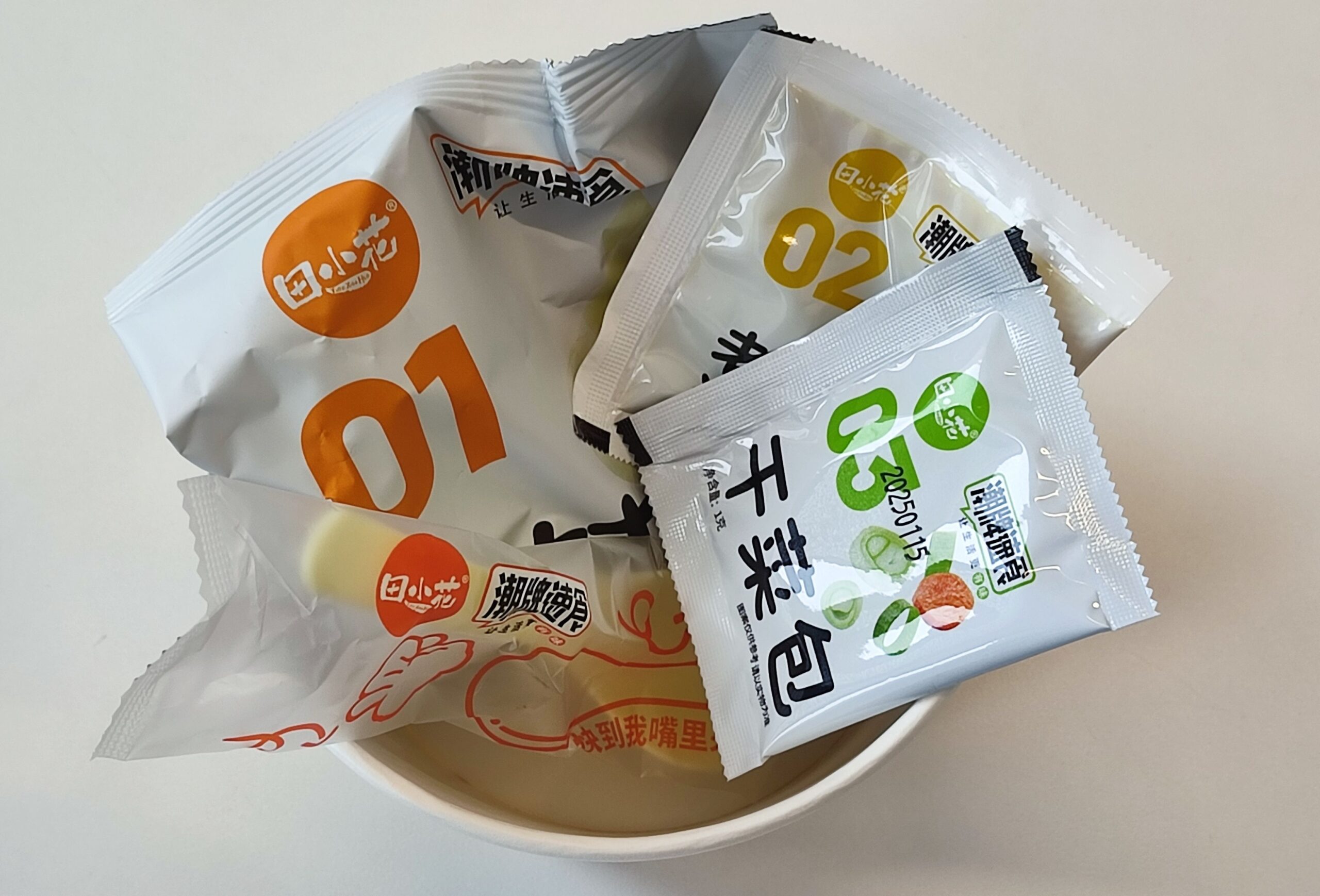 Wonton-Zutaten: Weizenmehl, Stärkeacetat, Gluten, Schweinefleisch, Kohl, Frühlingszwiebeln, Ingwer, Pflanzenöl, Salz, Zucker, Natriumcarbonat, Kaliumcarbonat, Natriumhexametaphosphat, Natriumtripolyphosphat, Natriumalginat, Natriumpyrophosphat, Polyacrylsäure Zutaten der Hühnersuppensaucenpackung: Pflanzenöl (enthält TBHQ), Hühnerbrühe (Hühnerknochen, Trinkwasser, Hühnerfett, Salz, Zucker, MSG, Dinatrium-5'-Wismut-Ribonukleotid, Lebensmittelaroma), Hühnerfett, Salz, MSG, Huhn, Ingwer, Frühlingszwiebeln, Zucker, Trinkwasser, Hefeextrakt, Maisstärke, Gewürze, Lebensmittelaroma, Dinatrium-5'-Wismut-Ribonukleotid, Kurkuma, Sorbinsäure, Natriumbenzoat Zutaten der Trockengemüsepackung: dehydriertes Eigelbpulver (Eigelbpulver, essbare Maisstärke, weißer Zucker, Maisöl, essbares Salz, Kaliumsorbat, MSG, Wolfsbeere, getrocknete Frühlingszwiebelblätter.