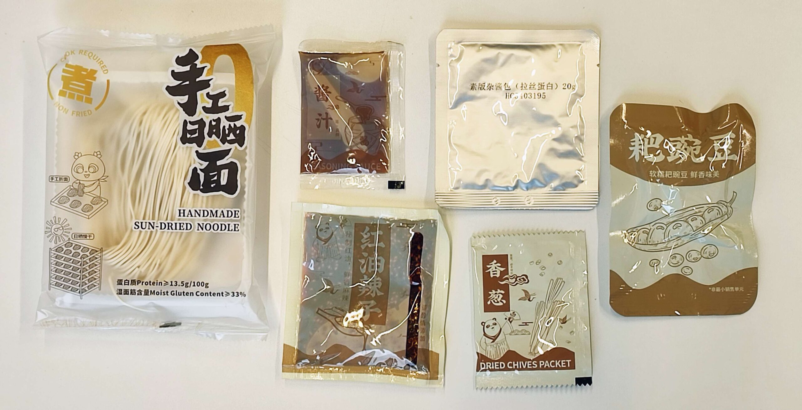 You Ni Yi Mian ist bekannt für die guten Nudeln – lt. Packung handgemacht und sonnengetrocknet, heute sind es dünne runde Nudeln. Dazu gibt es Chiliöl (Szechuanpfeffer ist auch dabei), gewürzte Sojasauce, vegetarische Hackfleischsauce, gekochte gelbe Erbsen und Frühlingszwiebel.