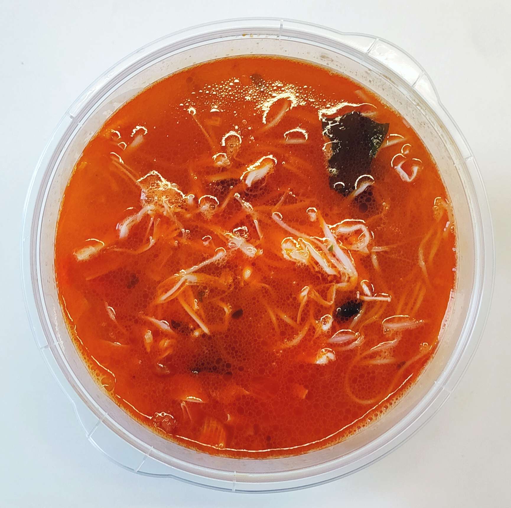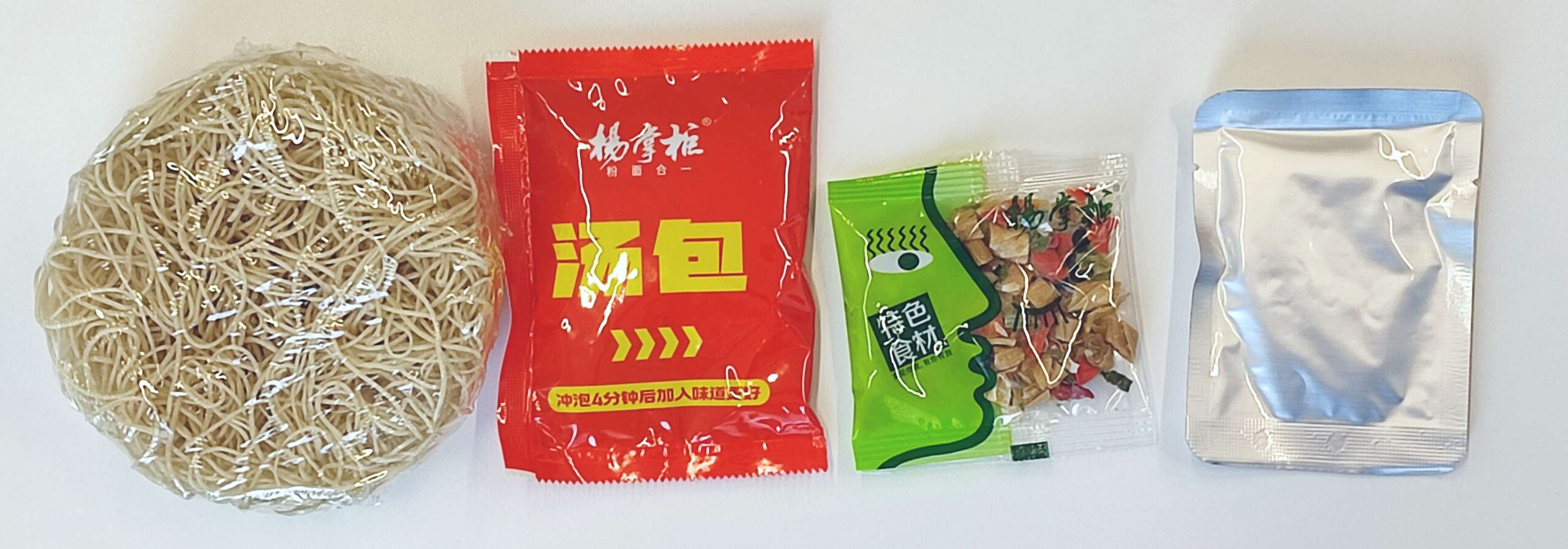 Die sparsam beschriftete Schüssel enthält ein großes Nest nichtfritierter Weizennudeln, außerdem einen Beutel Würzpaste, Trockenzutaten sowie eingelegte Enokipilze (und – nicht auf dem Foto – eine transparente Klappgabel).