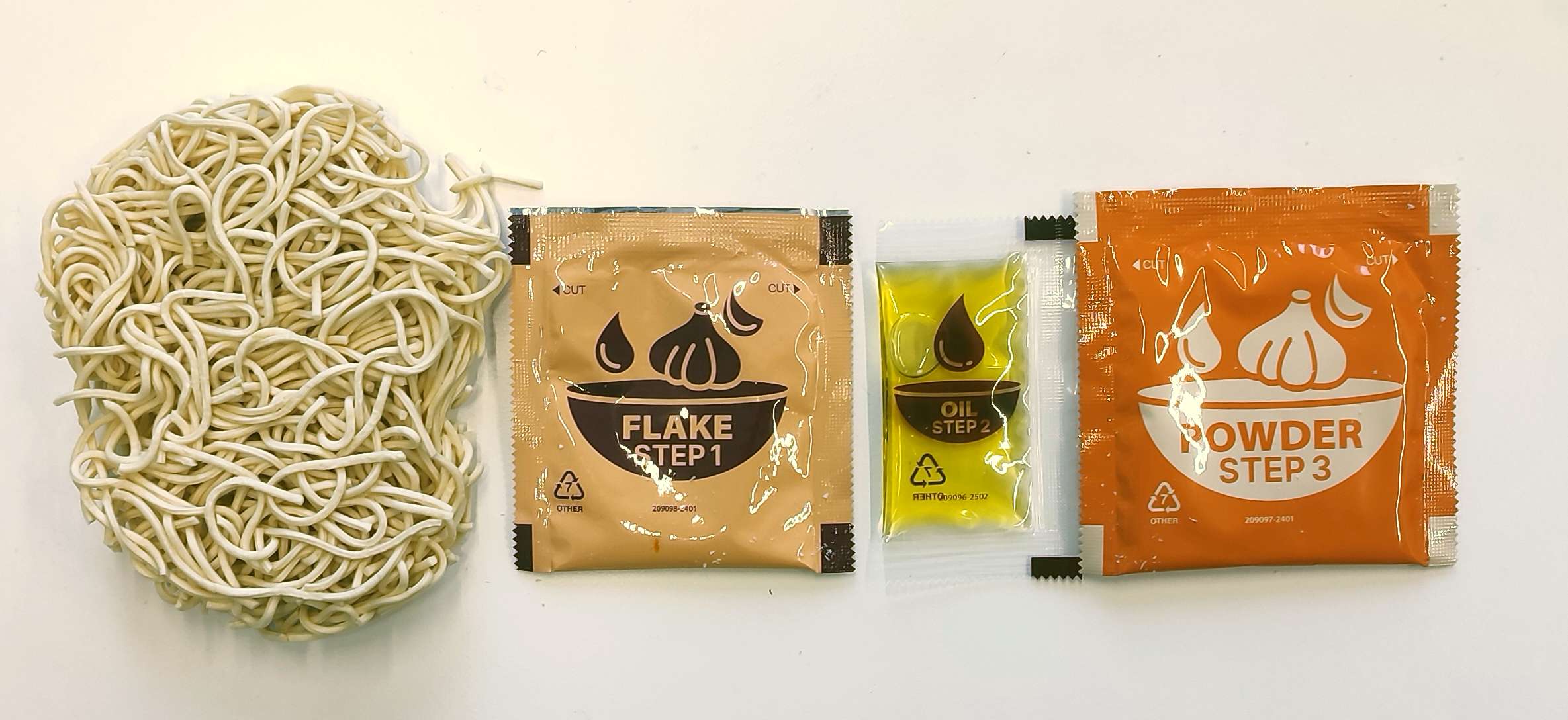 Beim Öffnen entströmt der Tüte ein fast schon erdiger Knoblauchgeruch. Außer den Nudeln gibt es „Flakes“ (gerösteter Knoblauch), Saucenpulver (mit Knoblauchgeschmack) sowie Öl (vor allem Olive). Alles ist wieder schön durchnumeriert, damit wir die Zutaten in der richtigen Reihenfolge zugeben.