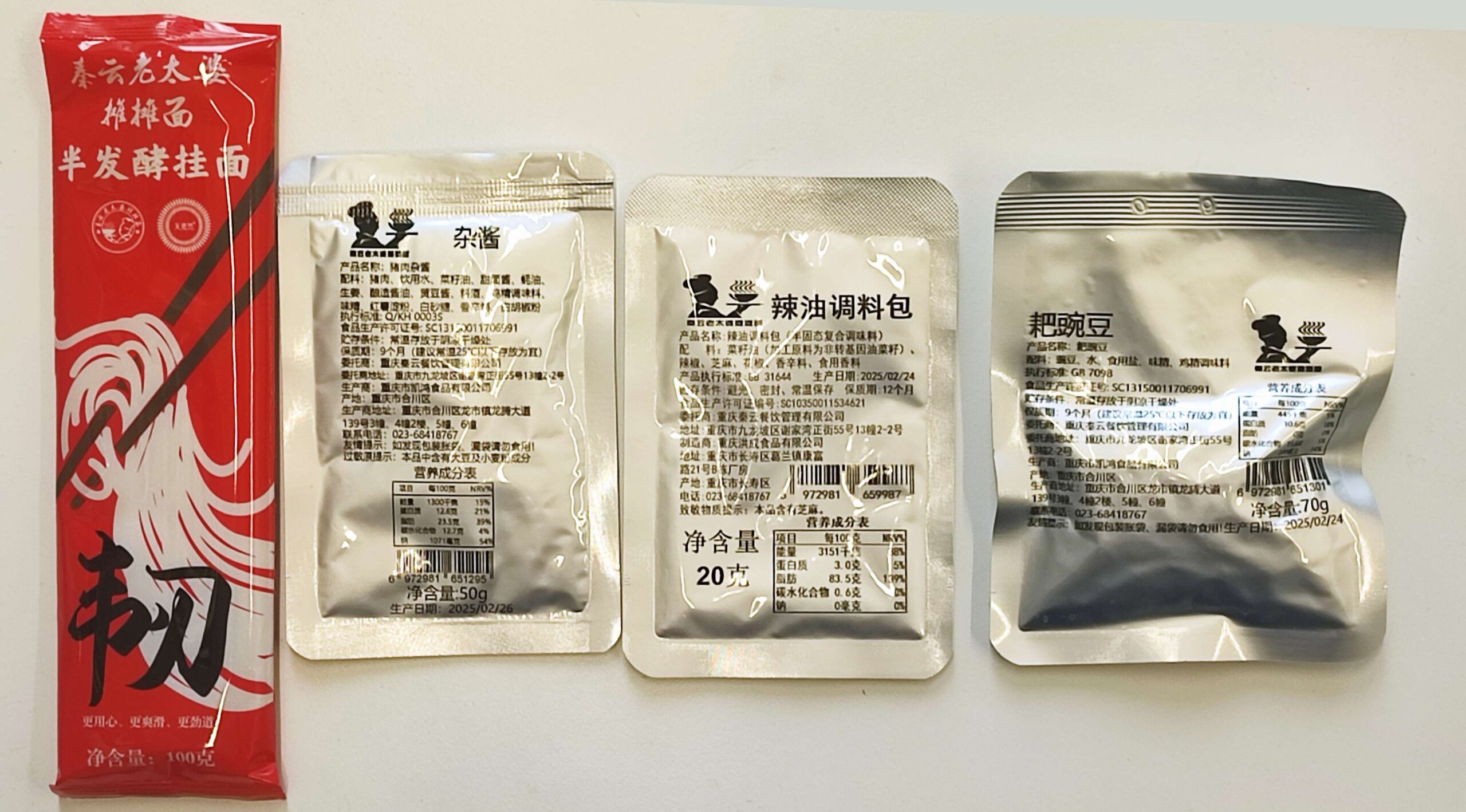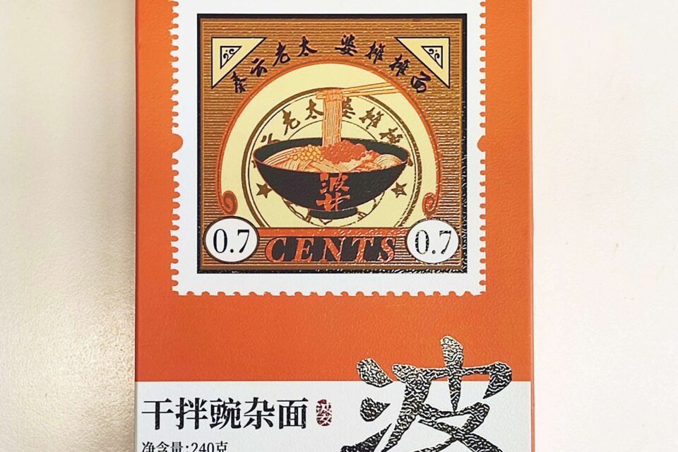 Dieses Gericht kommt in einer edel aufgemachten Box im Briefmarken-Look. Enthalten ist ein Bündel dünner, leicht alkalischer Nudeln und drei silbrige Tüten mit Fleischsauce (fein gehackt), mit Chiliöl (mit Sediment und Sesamsamen) und mit gekochten gelben Erbsen.