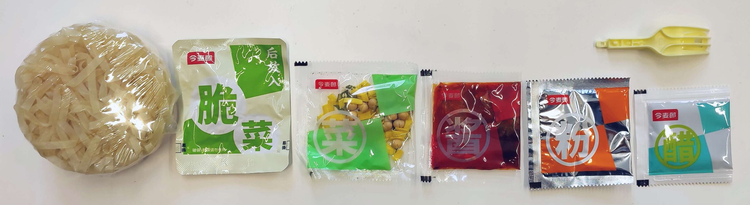 Bis vor einem halben Jahr habe ich Jinmailang nur mit klassischen Instantnudeln verbunden: fritierte Nudelblöcke und oft sehr salzige Brühen. Mittlerweile kommen von diesem Hersteller aber mehr und mehr Nudelsuppen auf den Markt, die nicht fritierte Nudeln enthalten und auch bei der Garnitur deutlich zugelegt haben. So auch heute: ein Frisbee nicht fritierter „messergeschnittener“ Nudeln („0 Prozent fritiert“) und fünf Würztütchen, u.a. mit eingelegtem Gemüse (Holzohr, Möhre, Sojasprossen), Trockenzutaten (u.a. geröstete Sojabohnen, Tofuhautstreifen), Suppenpulver, Würzpaste und Essig.