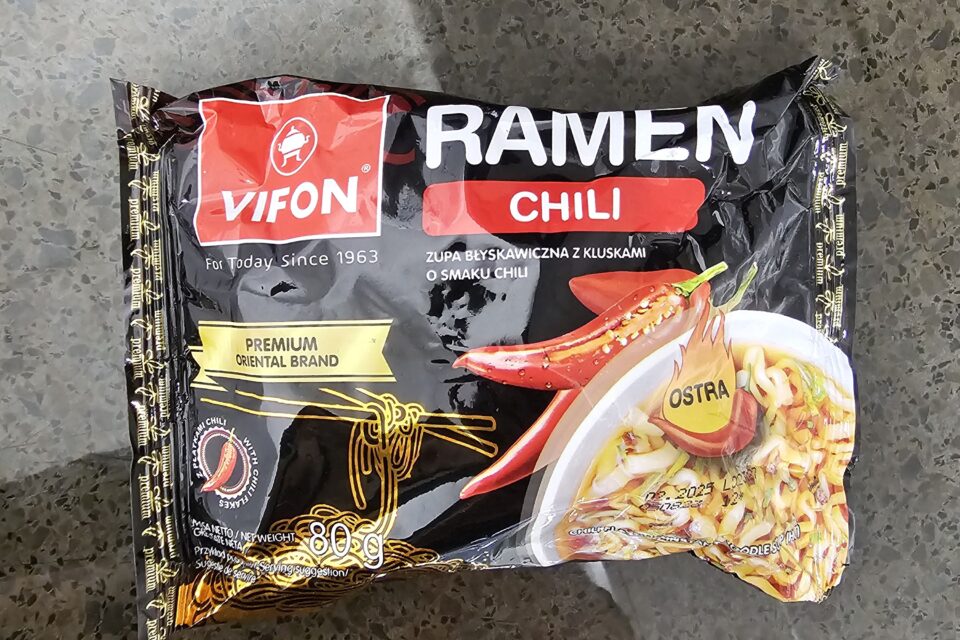 Dieses Süppchen ist fast schon kurios. Vifon. Aus Vietnam. Davon ein Ableger aus bzw. für Polen. Importiert aus den Niederlanden. Gekauft in Deutschland. Eine kulinarische Weltreise oder so ähnlich. Naja. Auf jeden Fall soll, wenig verwunderlich, nach Chili schmecken und scharf sein.
