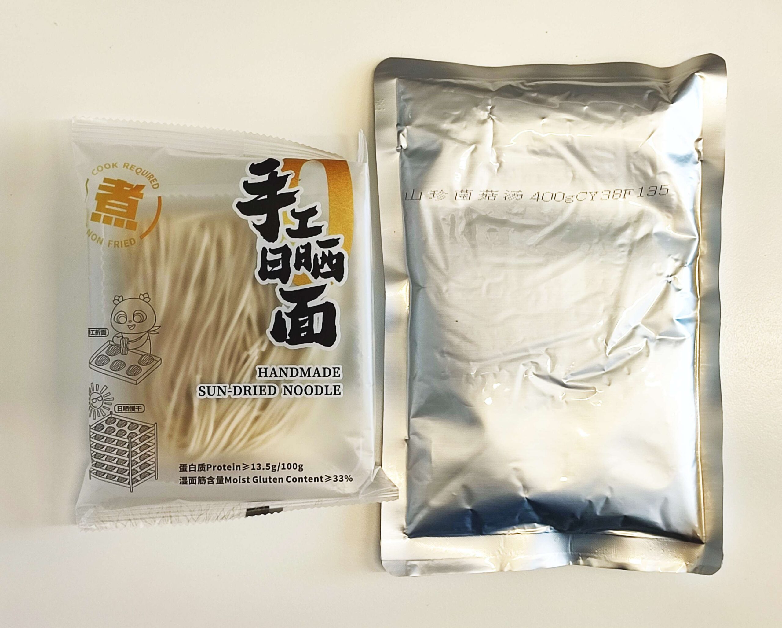 Huiji nennt wieder eine Kochzeit von 5-7 Minuten für die Nudeln – ich empfehle, nach 4 Minuten schon mal zu probieren. Während die Nudeln kochen, den Beutel mit Pilzsuppe ungeöffnet in einen Behälter mit kochendheißem Wasser geben und 3 Minuten erhitzen (alternativ ungeöffnet in den Nudeltopf geben). Anschließend den Beutel öffnen, in eine Suppenschüssel geben und die Nudeln zugeben. Umühren, fertig!