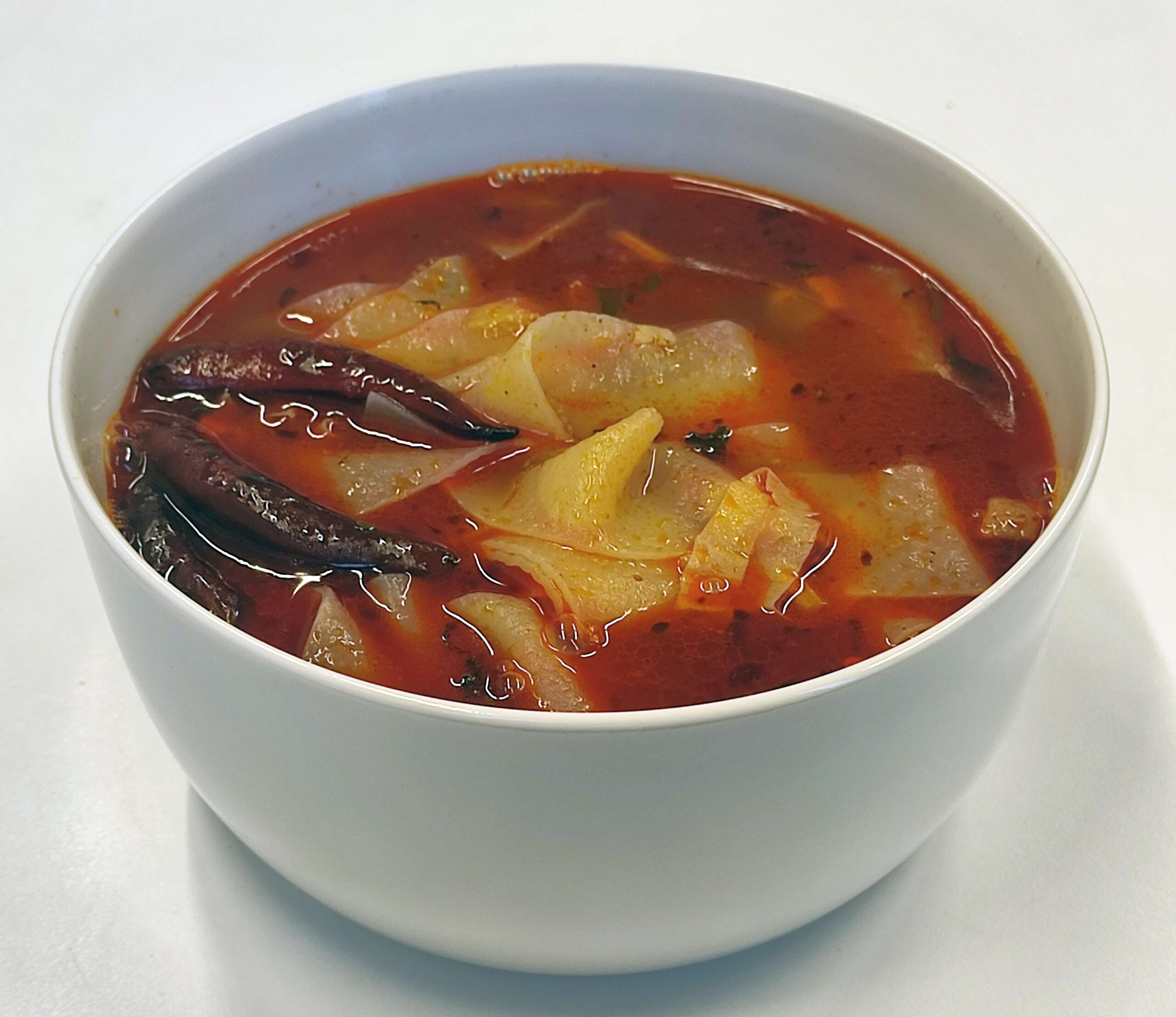 Riecht nach einer gut gewürzten Rinderbrühe, obenauf schwimmen die Chilischoten und rötliches Öl.