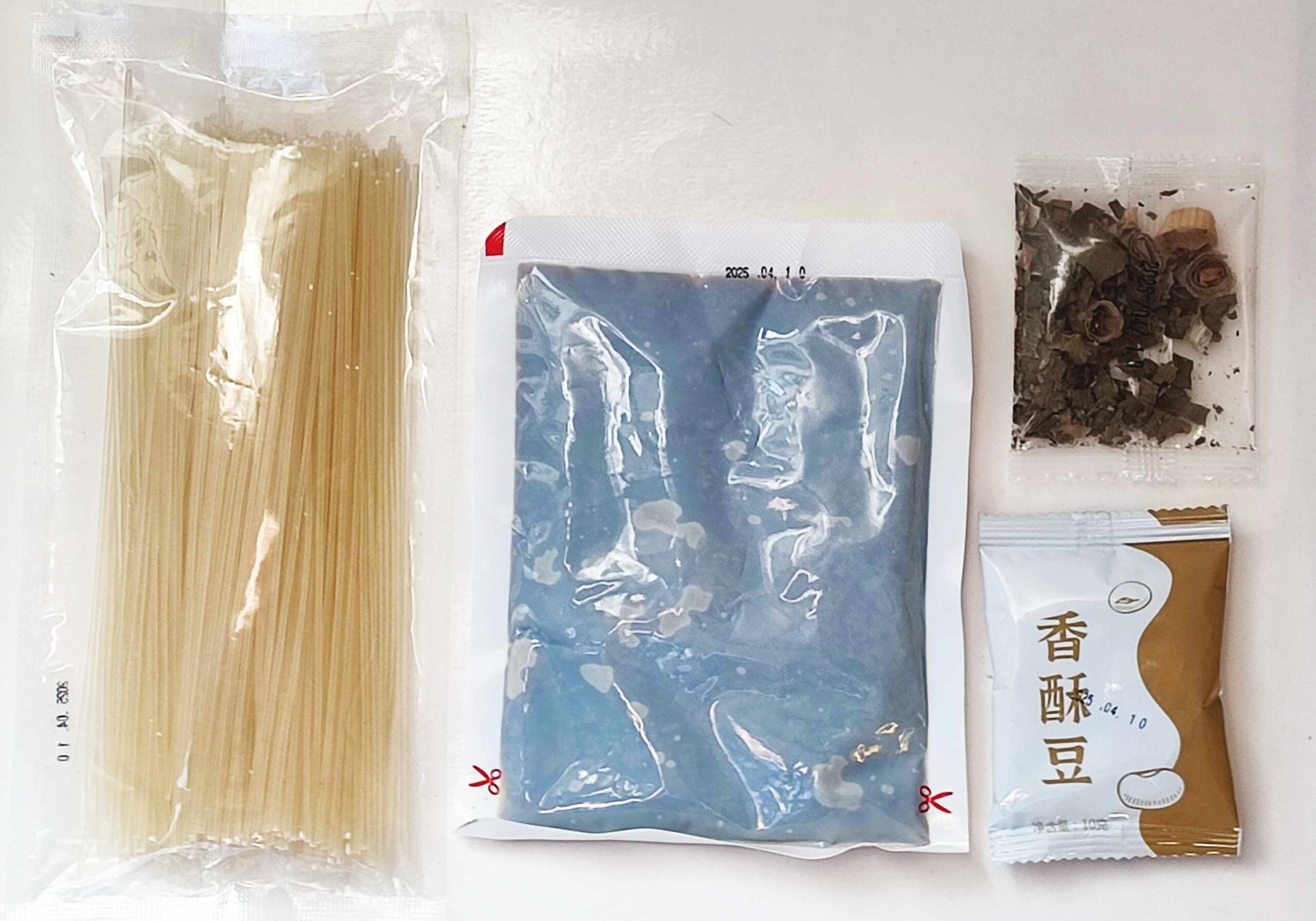 Das Paket bringt stolze 266 Gramm auf die Waage – eine Packung Reisnudeln, ein Riesenbeutel eingelegtes Gemüse (Senfkohl, Rettich und Chili), ein Tütchen mit Frühlingszwiebel sowie geröstete Sojabohnen.