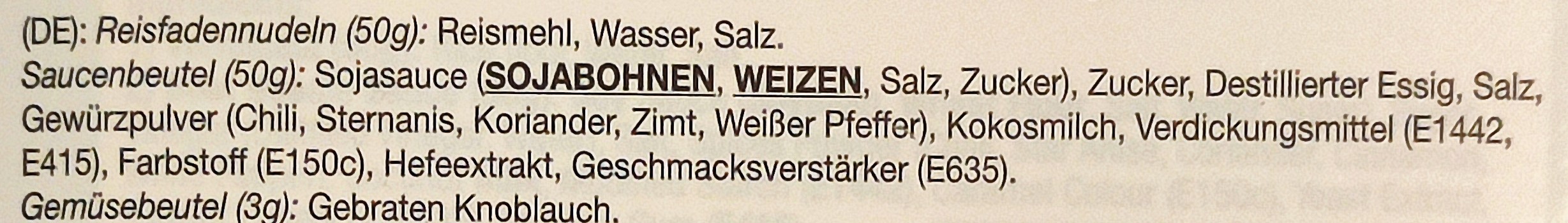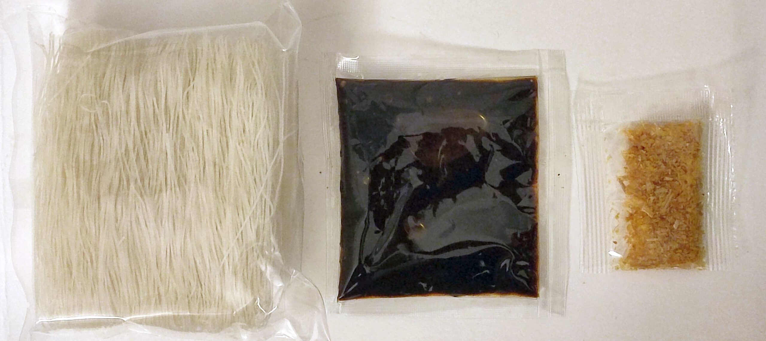 Der Karton enthält eine Tüte mit einem Wickel Reisvermicelli, außerdem Tüten mit Suppenkonzentrat und geröstetem Knoblauch (identisch zur letzten Sorte #3169):