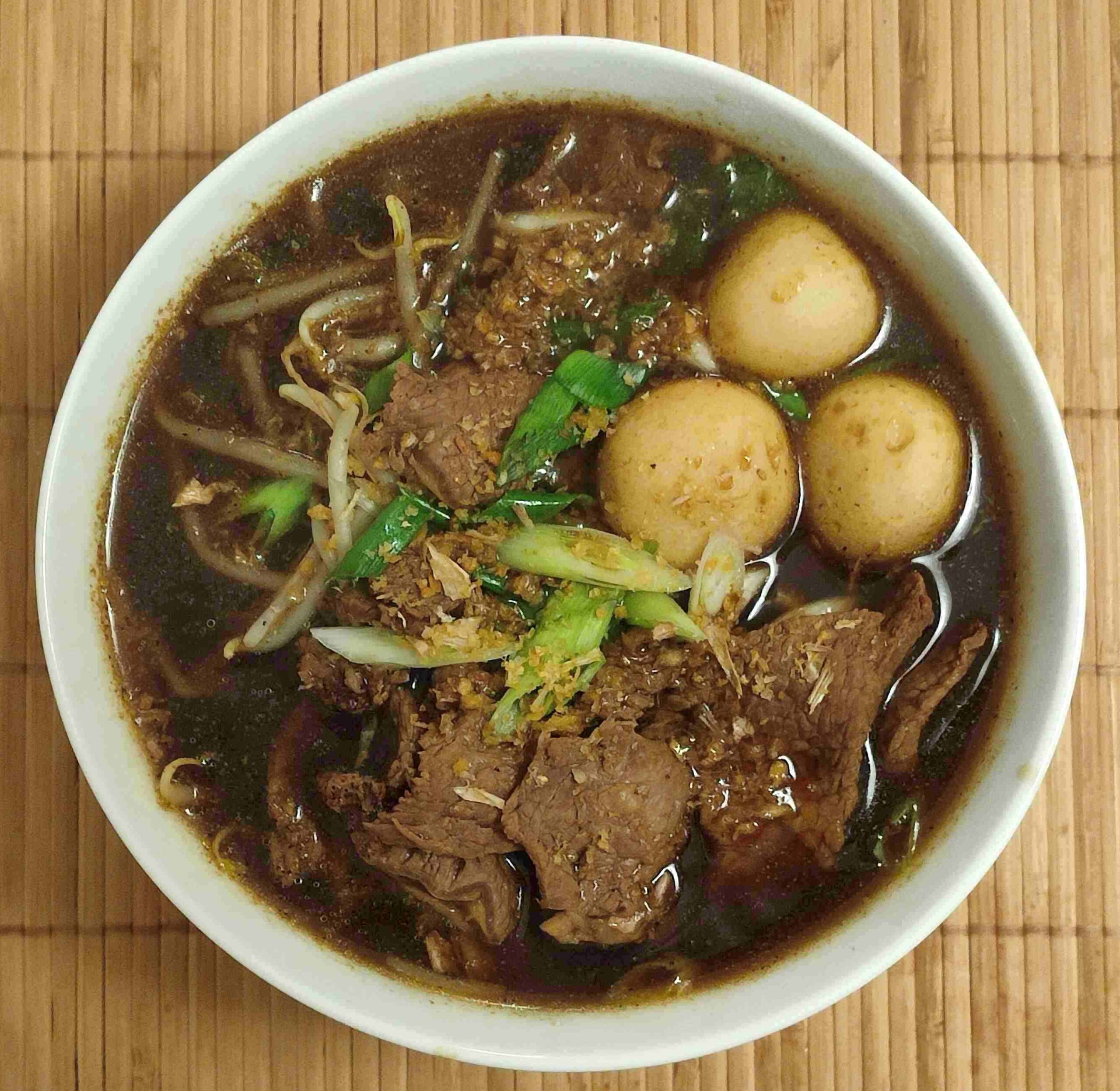 Dunkle Brühe mit Nudeln, es riecht vor allem nach Anis und Zimt.