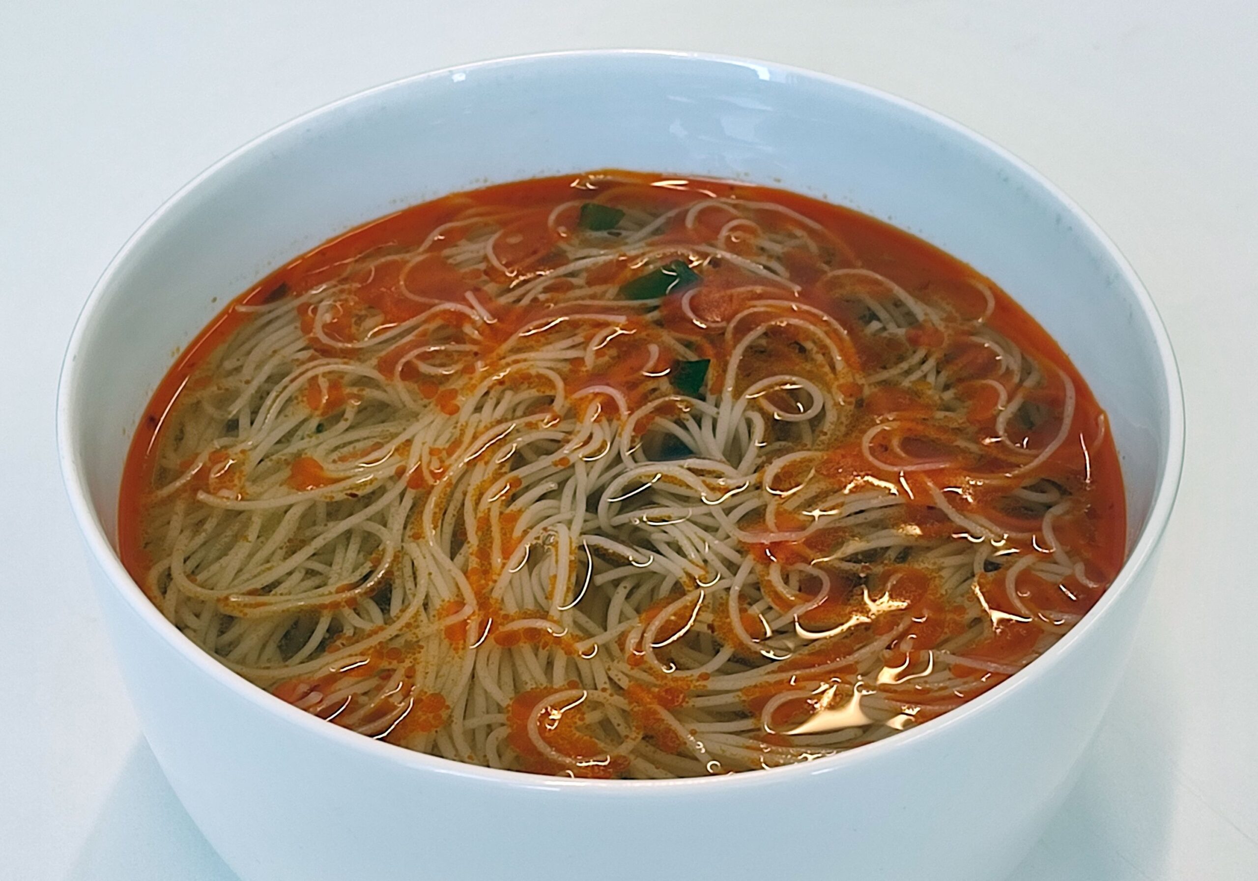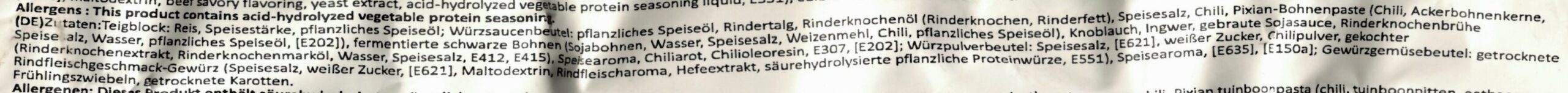 Ich hab die Nudeln dieses Mal in Kenntnis der Anleitung etwas länger ziehen lassen, und tatsächlich sind sie nach gut 6 Minuten nicht mehr so rauh und werden ganz leicht klebrig, so dass die Suppe besser haften bleibt. So gefallen sie mir nochmal besser! Die Brühe schmeckt kräftig nach Rindfleisch (und -talg), Fünfgewürz, Ingwer – und ist richtig kräftig scharf! Chili und Pfeffer unterstützen sich da wohl gegenseitig. Dazu gibt es etwas Gemüse – nett, aber es bleibt geschmacklich im Hintergrund. Eine solide Suppe – passt!