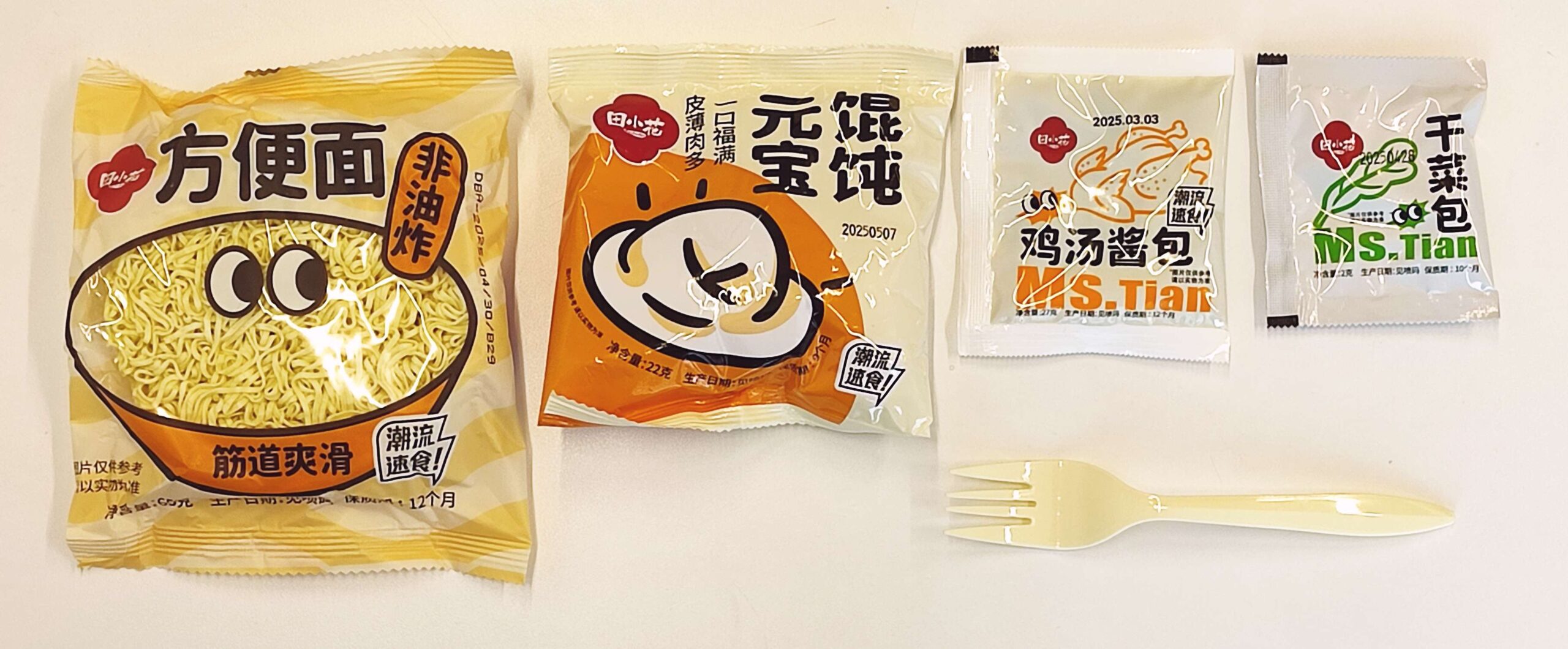 Die große, aber leichte Schüssel enthält eine Tüte mit 6 großen Wontons, zum Glück weitgehend intakt, außerdem eine Tüte mit Hühnersuppenkonzentrat, ein Tütchen mit Trockenzutaten (Eipuffer, Gojibeern, Frühlingszwiebel) und ganz unten ein Nudelrad – nicht fritiert, sondern luftgetrocknet. Als Bonus gibt es eine Gabel.