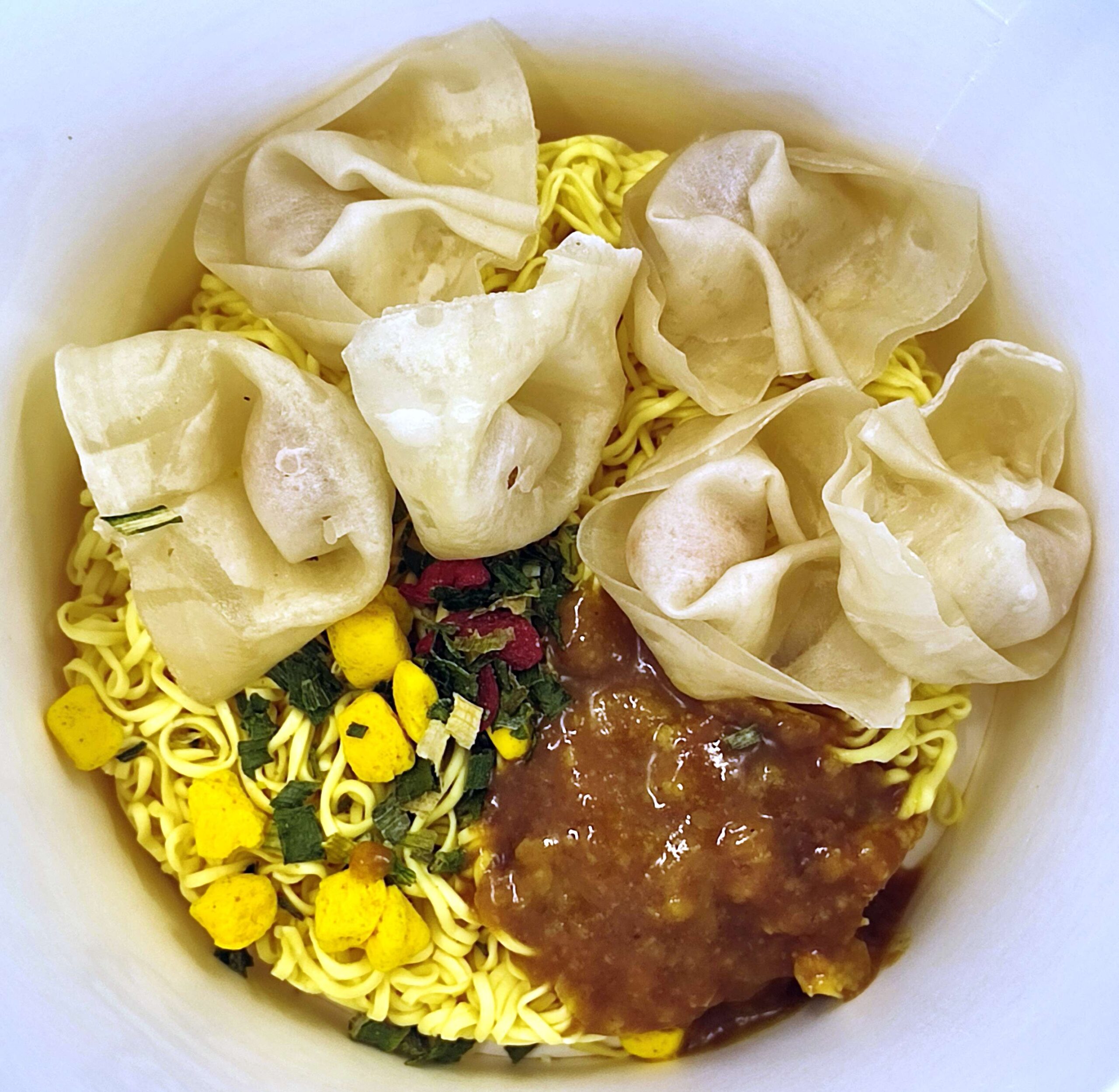 DDie Wonton mitsamt Füllung sind nach 5 Minuten wieder gut rehydriert, haben aber doch ein paar winzige Löcher. Die Fleischfüllung schmeckt nicht sonderlich kräftig, vielleicht hat sich der Fleischgeschmack ja in der Brühe verflüchtigt. Was für ein Fleich? Keine Ahnung, auch die chinesische Zutatenliste sagt nur „Fleisch“. Mystery Meat? Egal. Die Nudeln sind dünn, bissfest, federnd – und würden von einer separaten Kochbehandlung sicher profitieren. Nudeln und Wonton schwimmen in einer leckeren Hühnerbrühe, etwas ölig, sehr mild gewürzt mit etwas Ingwer und Zwiebel (wer es etwas konzentrierter mag, sollte etwas weniger Wasser verwenden). Schärfe ist keine vorhanden. Optisch richtig gut, Eipuffer, Gojibeeren und Frühlingszwiebel sorgen für Abwechslung. Sehr gut! |