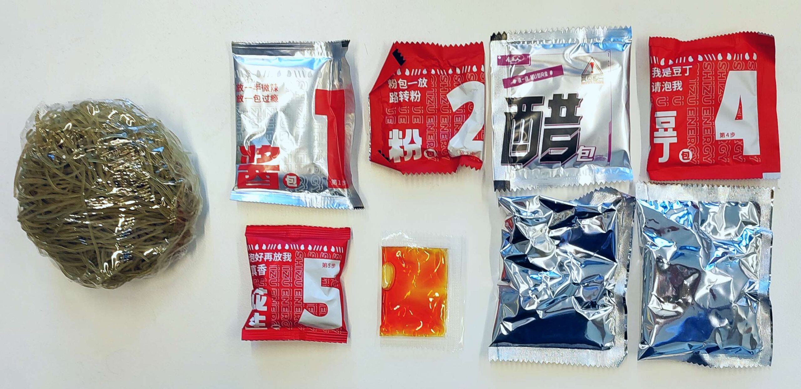 Der Preis ist ambitioniert, aber Shizuren liefert uns dafür eine üppige Ausstattung: neben dem (mit Spinat grün gefärbten) Glasnudelnest gibt es ganze acht (!) Tüten: zweimal getrockneten Koriander, Suppenkonzentrat, Suppenpulver, schwarzen Essig, gewürztes Öl, Tofuhautröllchen sowie geröstete Erdnüsse mit Chili und Szechuanpfeffer.