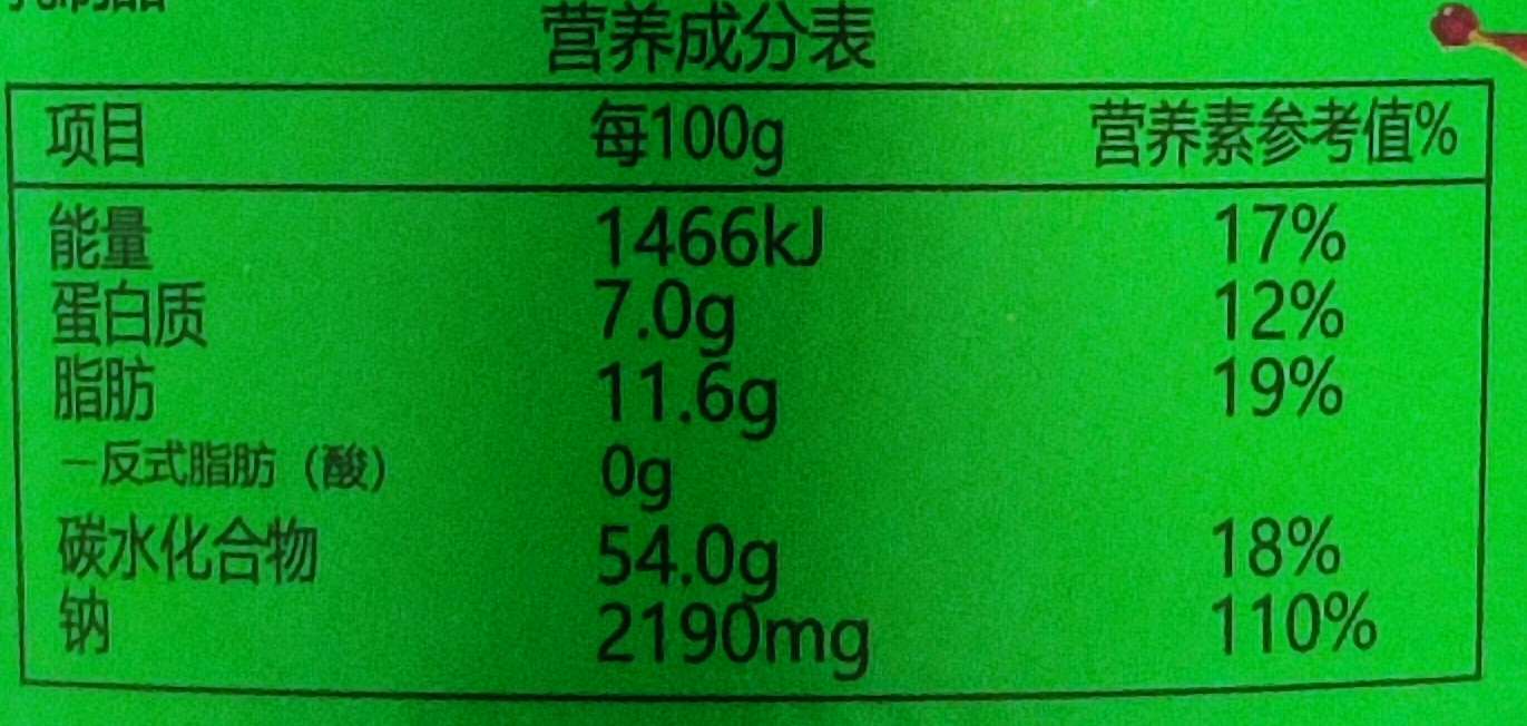 Noodle Cake: Sweet potato starch, spinach powder, drinking water, edible salt. Seasoning packet: vegetable oil, chili, soy sauce (containing caramel color), white sugar, chicken powder seasoning, edible salt, monosodium glutamate, sesame, scallions, garlic, edible flavoring, spices, sesame oil, food additive (capsicum red potassium sorbate). Seasoning powder packet: edible salt, monosodium glutamate, chili powder, white sugar, chicken powder seasoning, spices, food additive (5'-inosodium 5'-ribonucleotide disodium malic acid, citric acid, silicon dioxide). Seasoning vinegar packet: vinegar (drinking water, sorghum bran, barley, peas, edible salt), soy sauce (containing caramel color). Sesame oil packet: vegetable oil, Sichuan peppercorns, chili, scallions, spices, sesame oil, food additive (capsicum red). Bean packet: bean products (soybean flour, drinking water, edible salt). Vegetable packet (2.5g x 2 packets): dehydrated coriander. Peanut packet: peanut kernels, vegetable oil, edible chili peppers, sichuan peppercorns, sichuan peppercorn oil, white sugar, and MSG.