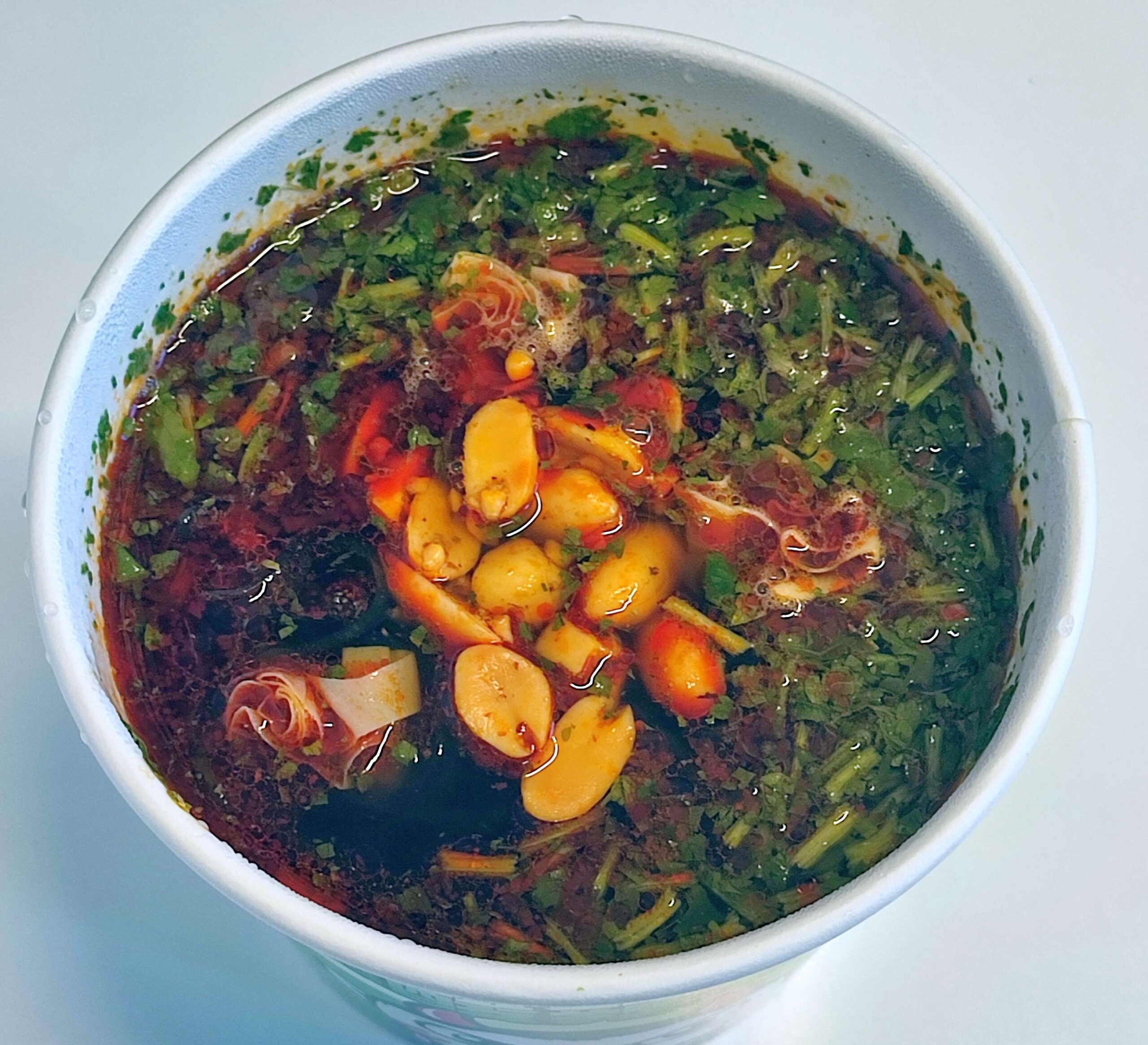 Fazit: die Glasnudeln sind dick, flexibel, ziemlich weich und haben nicht allzu viel Biss – mir gefallen sie in dieser Suppe dennoch sehr gut. Die Suppe ist scharf-würzig und anfangs nur leicht sauer: fermentierte Soja, Chili, Knoblauch, Zwiebel und zahlreiche Gewürze, darunter auch etwas Szechuanpfeffer; die Säure nimmt zu, je mehr die Suppe abkühlt. Als Garnitur gibt es knackige und lecker gewürzte Erdnüsse und ein paar Tofuhautröllchen. Der Koriander bedeckt die gesamte Oberfläche und schmeckt auch nach Koriander, kommt aber an frisches Kraut nicht ran. Die Chilischärfe ist im mittleren Bereich. Mir hat dieser Becher sehr gut gefallen, trotz des Preises! |
