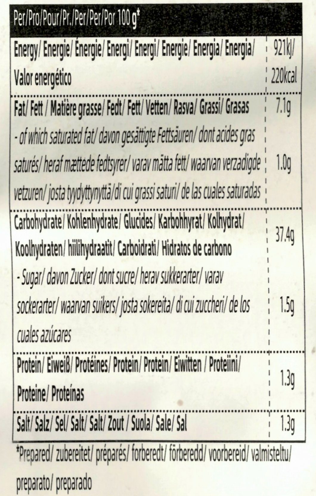 | kcal 100 ml/g (Gesamt): | 220 / 385 kcal |