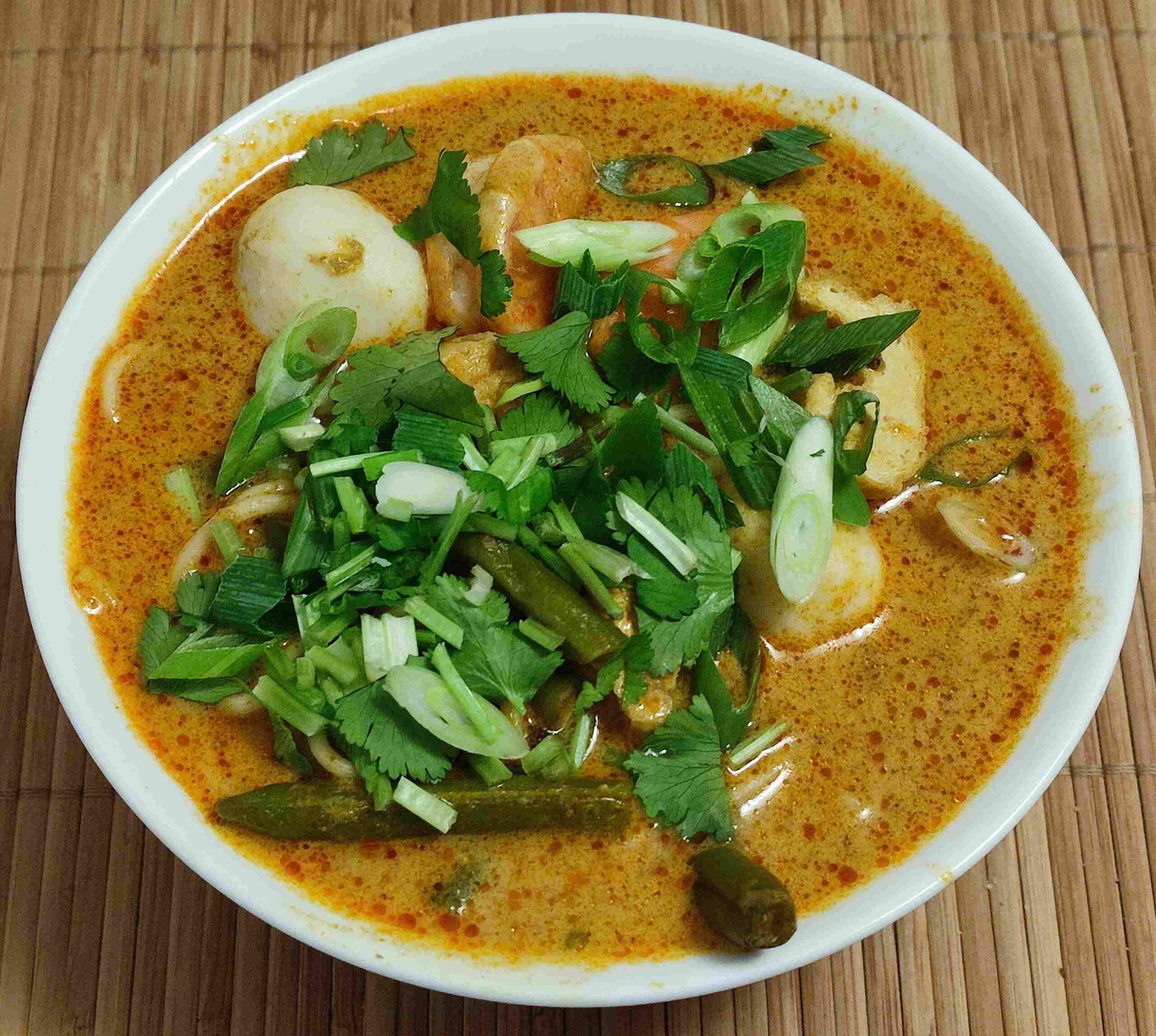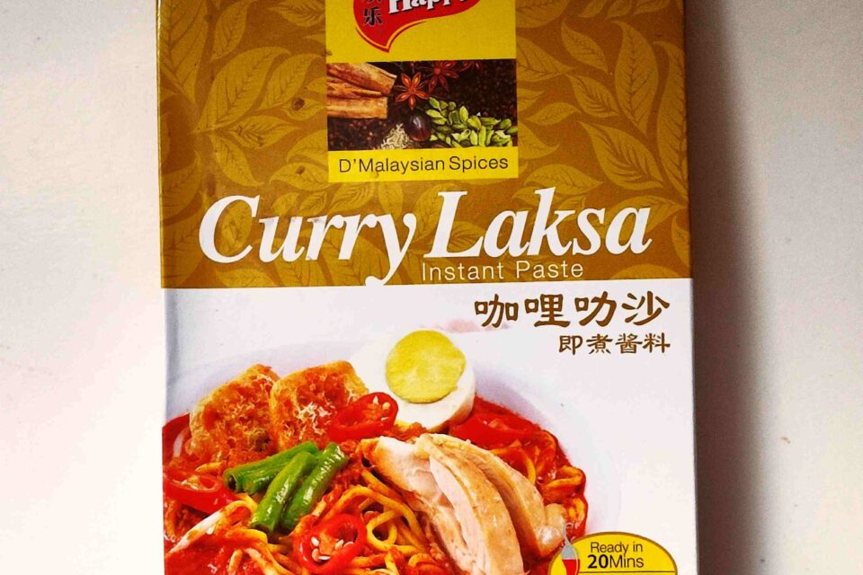 Der Name sagt es schon – das hier ist eine Curry-Laksapaste. Außerdem benötigt werden Kokosmilch, Gemüse, Protein und Nudeln (nach persönlichem Geschmack Reis- oder auch Weizennudeln). Außerdem werden vorgeschlagen fritierter Tofu , blanchierte Mungbohnensprossen, als „Topping“ gedämpftes Huhn, gekochte Shrimps und/oder Fischbällchen.