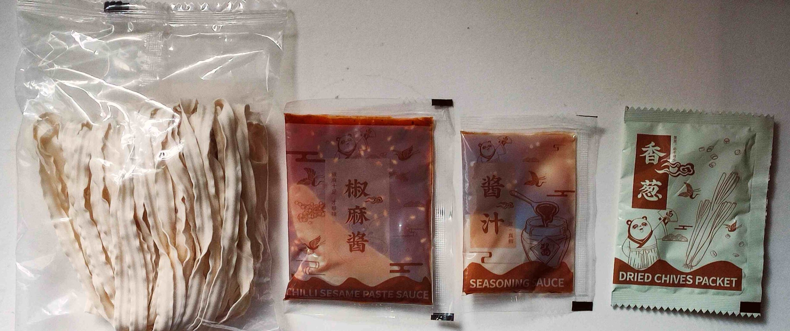 Das Tütenfoto deutet an, dass grüner Szechuanpfeffer mit an Bord ist, für die Schärfe wird eine von fünf möglichen Chilischoten angegeben. Wir bekommen einen Wickel sonnengetrockneter geschnittener Nudeln (am Rande leicht gewellt), dazu Tütchen mit Sesamsauce, mit Würzsauce und mit Schnittlauch.