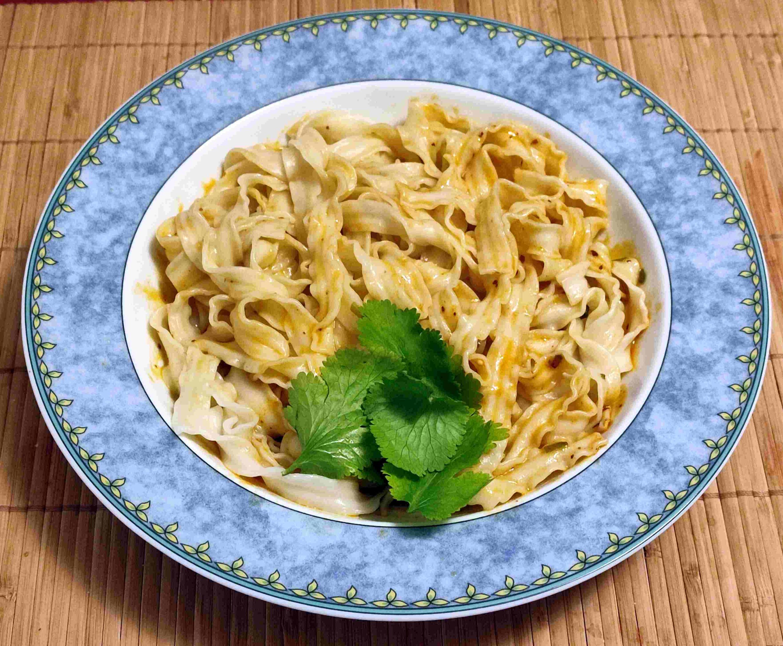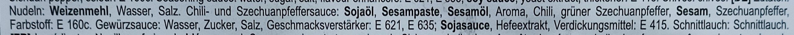 Fazit: wie gewohnt erstklassige, schmackhafte Weizennudeln, glitschig, je nach Kochzeit bissfest. Sehr gut! Die Sauce schmeckt nach Sesampaste, Sojasauce und Szechuanpfeffer, vom Schnittlauch gibt es etwas Zwiebliges dazu. Die Schärfe ist gemäßigt, aber auf jeden Fall ist es schärfer als die #2850. Optisch bleibt das Gericht simpel, als Garnitur gibt es nur die Schnittlauchschnipsel. Mir gefällt das hier trotzdem gerade sehr gut! |
